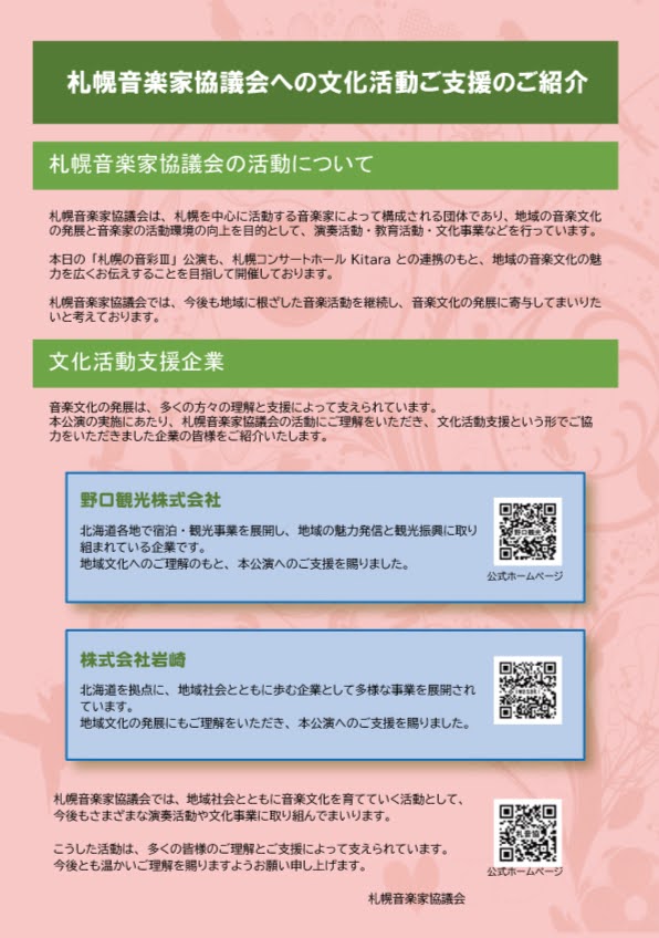 文化活動支援企業 3月21日の「札幌の音彩III」公演におきまして、以下の企業よりご支援を賜りました。厚く御礼申し上げます。 野口観光株式会社 株式会社岩崎 ※詳細は→こちら 今月のコラム −・−・−・− 2026年2月、創立メンバーのお一人であった青木恵美子さんが逝去されました。1981年に行われた「創立メンバーによる20年記念演奏会」のプログラムに寄せられた文を掲載いたします。 青木恵美子(ソプラノ): 市民会館の衝立で仕切られた食堂の一隅で、札幌市の音楽家として名をなす20数人の方達による「音楽家の組織団体結成の為の会」に、村井満寿先生、工藤健次先生の御推薦を受け、若輩の私も緊張し乍ら参加させて頂いたのは、20年前の出来事というより、つい5・6年前の事の様に思われます。その間に、札響、教育大特音、大谷短大等の誕生を見るに及び、札幌も名実共に文化都市として長足の進歩を遂げました。その中にあって、音楽家協議会が札幌市の文化向上の一端を荷担って来た事は云う迄もありません。20年を機に、更に充実した団体として発展を見る為にも「密度の濃い演奏活動」と聴衆の方達の音楽に対する「心と耳」を持った「するどい批判」こそが、今後の期待と云えるのではないでしょうか。協議会員の皆様の認識と札幌市民の皆様の御声援を切にお願い致します。 |